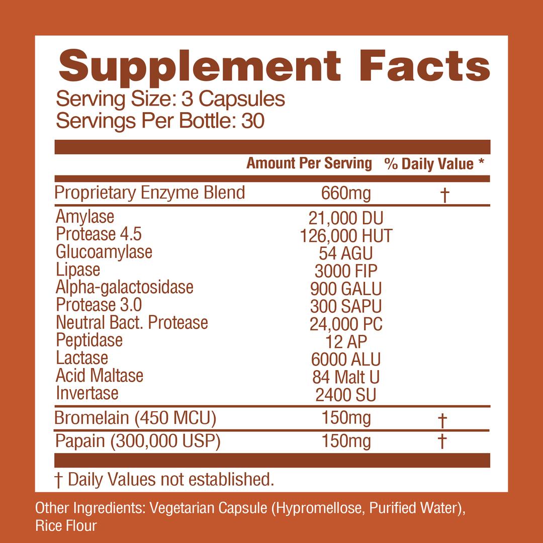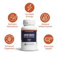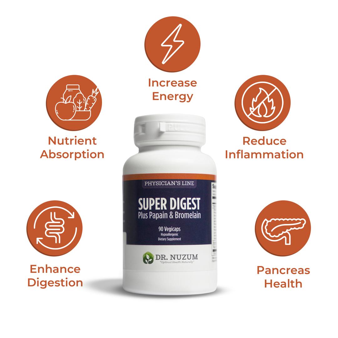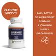 Super Digest improves the digestion of proteins, which many believe are the most difficult to digest. These are the types of enzymes that also support the body's ability to regulate inflammation and offer excellent support to the pancreas by reducing its digestive workload. The additional digestive support provided by Super Digest, in the form of both fat- and carbohydrate-digesting enzymes, assists in the digestion of dietary fibers and other carbohydrates, reducing gas production and bloating. It also supports the digestion of fats, thus reducing bloating, diarrhea, and “greasy” stools.